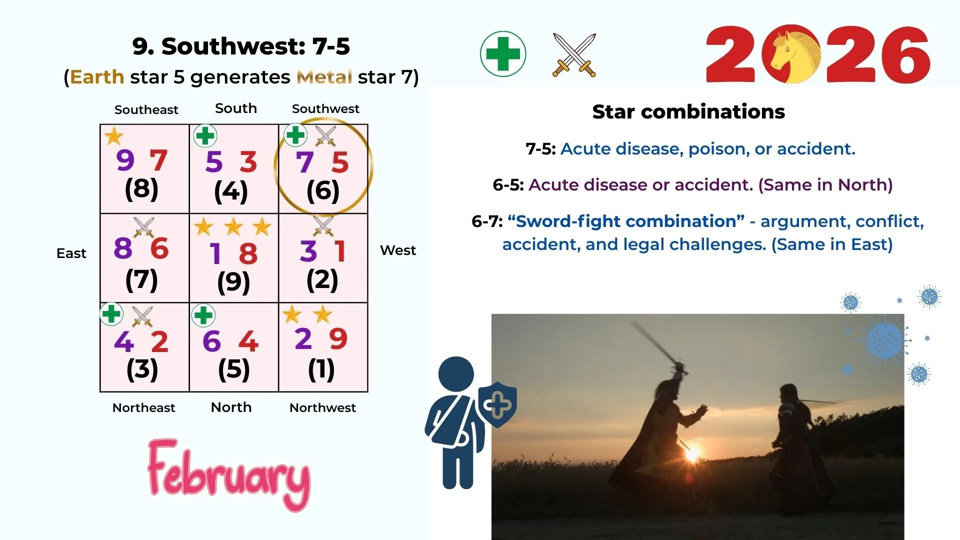 February’s Feng Shui chart shows timely stars 1 and 9 in the west and northwest. Health issues are more related to the Southwest and the Northeast. Stronger fighting tendency in the South and Southeast.