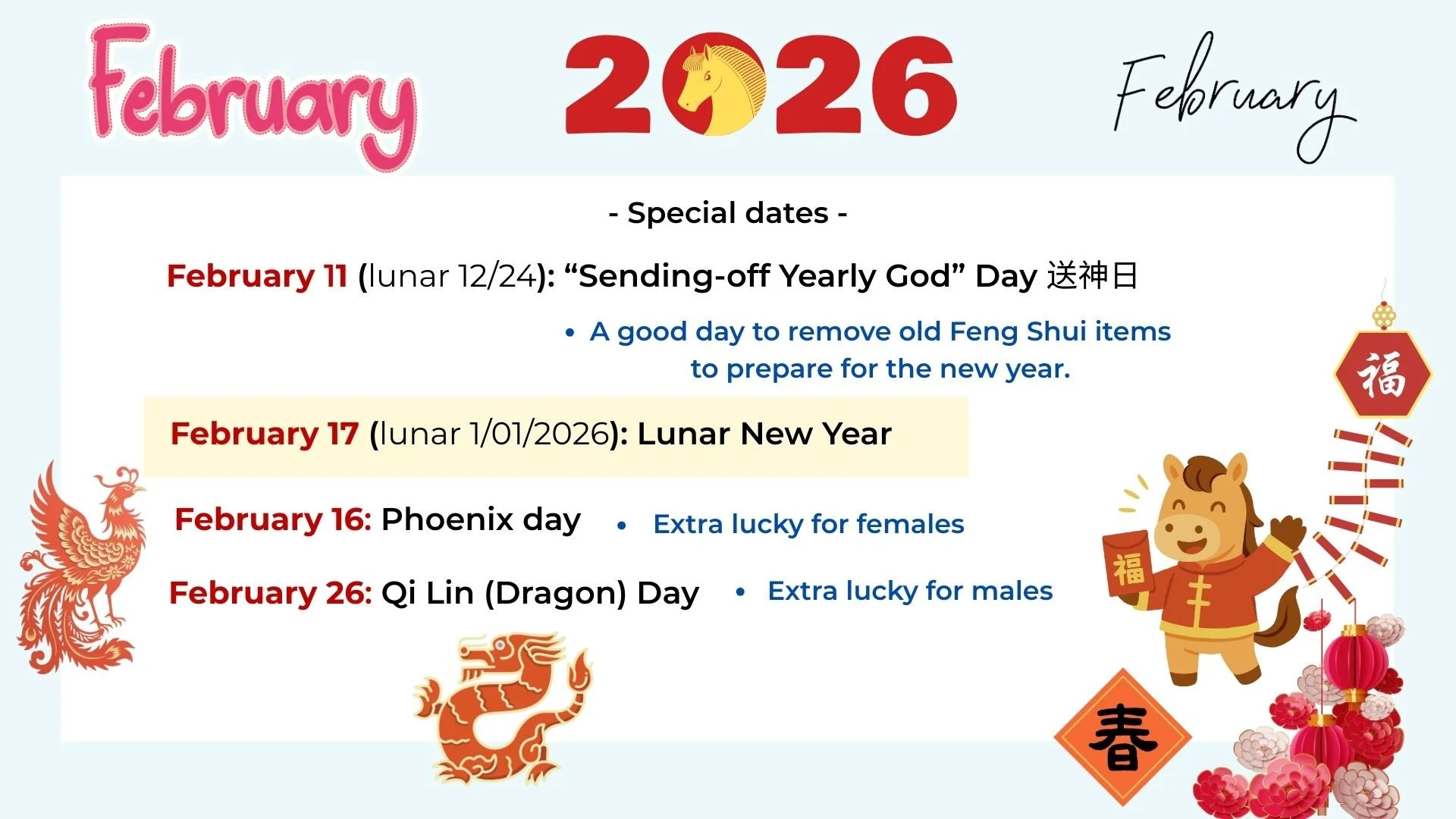 The Chinese New Year is on February 17. Phoenix day is on February 16, and Qi Lin day is on February 26.